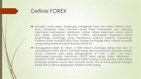 Forex trading adalah kegiatan jual beli mata uang asing atau valuta asing dengan tujuan memperoleh keuntungan dari selisih nilai tukar mata uang. Istilah “forex” merupakan singkatan dari “foreign exchange” yang berarti pertukaran mata uang asing. Dalam apa itu forex , kita perlu memahami bahwa forex di lakukan secara online melalui platform yang disediakan oleh broker forex.