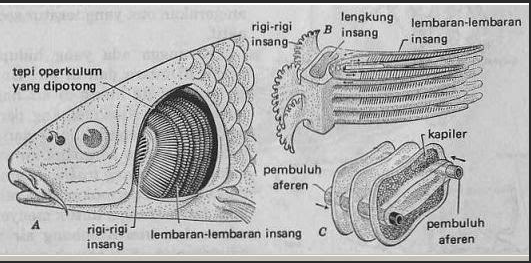 Ketika ikan menggerak-gerakkan insangnya, air mengalir melalui filamen insang. Filamen ini memiliki permukaan yang luas dan terdapat banyak pembuluh darah kecil (kapiler) di dalamnya. Ketika air mengalir melalui filamen insang, oksigen dalam air berdifusi melalui membran sel dan masuk ke dalam kapiler. Di sana, oksigen akan diangkut oleh darah ikan dan dibawa ke seluruh tubuhnya.
