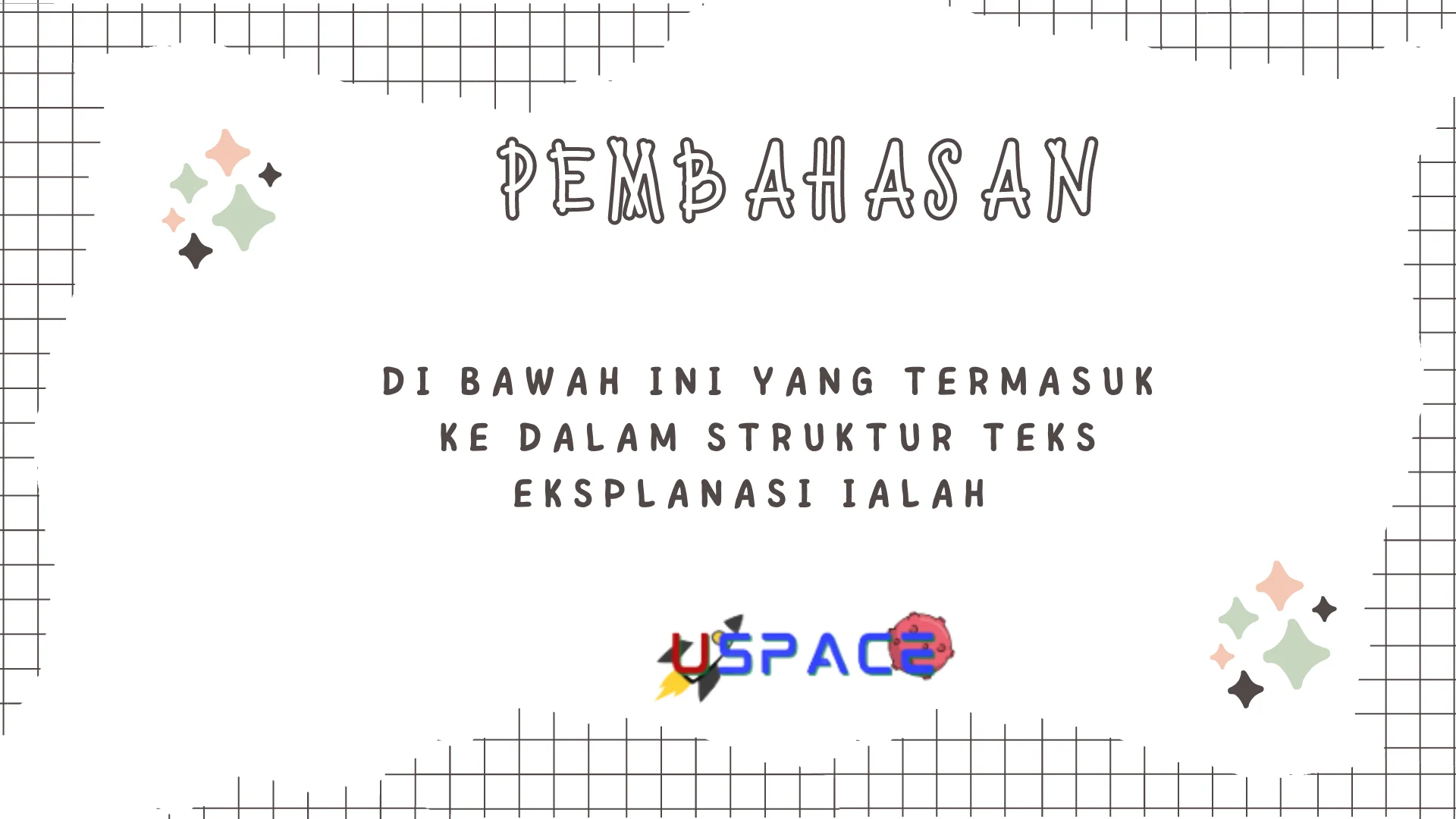 Selamat datang di Uspace.id, blog untuk berdiskusi seputar pembahasan soal pelajaran dari SD, SLTP, SMU Sampai Perguruan Tinggi. Kali ini kami akan bahas sebuah pertanyaan yang banyak ditanyakan di Soal Ujian Sekolah, Pertanyaannya adalah : Di Bawah ini Yang Termasuk ke Dalam Struktur Teks Eksplanasi Ialah