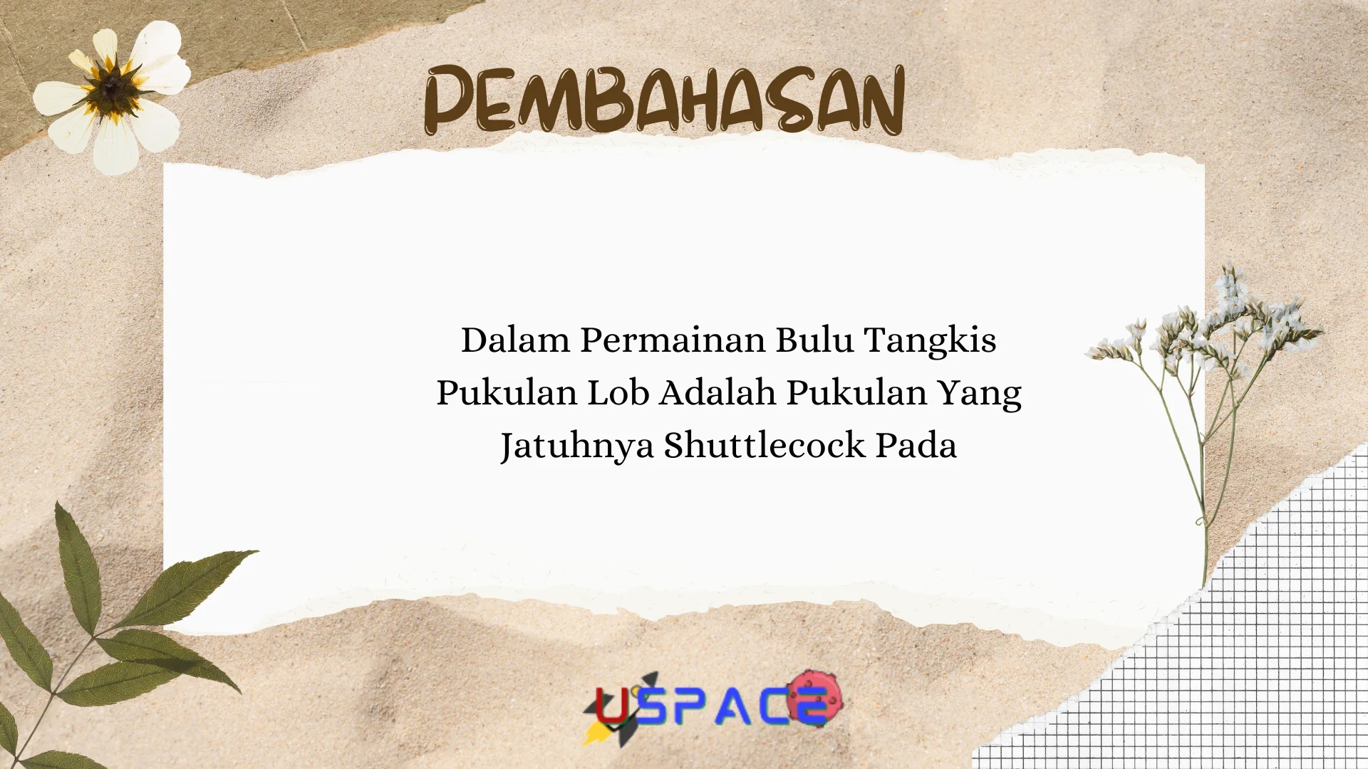 Selamat datang di Uspace.id, blog untuk berdiskusi seputar pembahasan soal pelajaran dari SD, SLTP, SMU Sampai Perguruan Tinggi. Kali ini kami akan bahas sebuah pertanyaan yang banyak di tanyakan di Soal Ujian Sekolah, Pertanyaannya adalah : Dalam Permainan Bulu Tangkis Pukulan Lob Adalah Pukulan Yang Jatuhnya Shuttlecock Pada